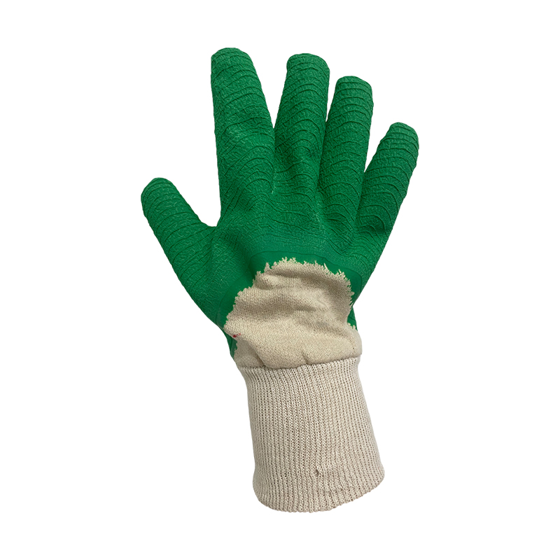 Latex glove,jersey supporting liner,green crinkled latex,3/4 coating,white knit wrist,secure grip with anti-skid palm.