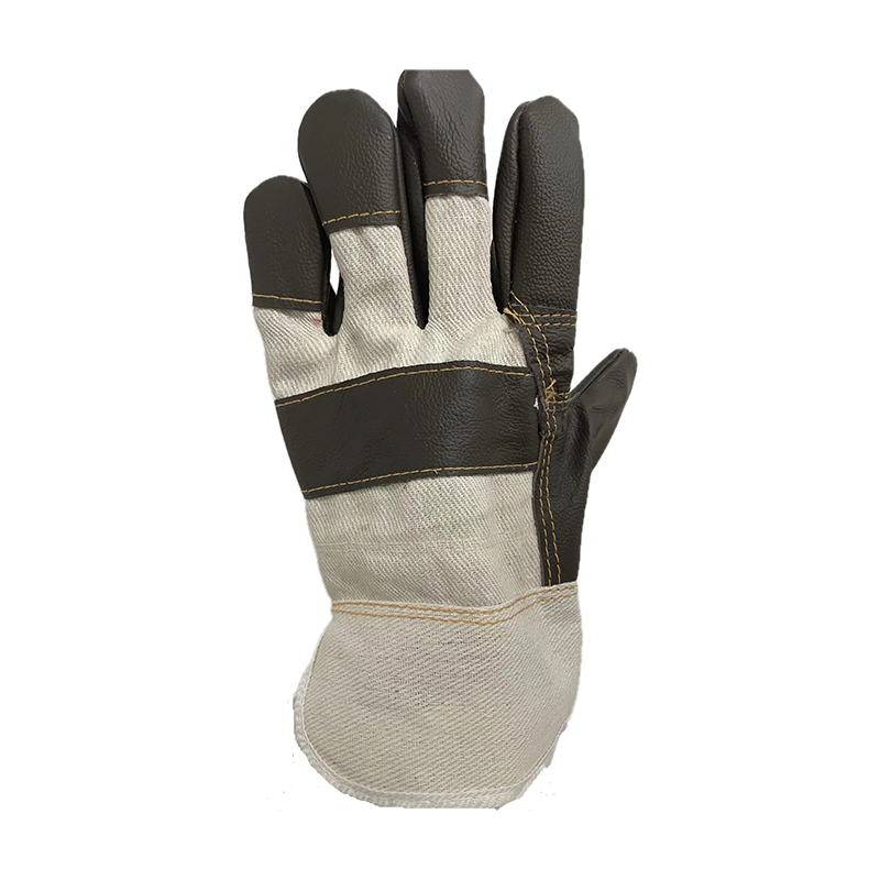 Grain cowhide furniture leather glove,assorted dark colors,patch palm,white cotton back and cuff,half lined. EN 388 standard