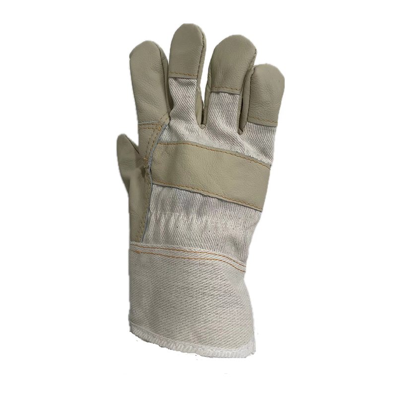 Top cowhide furniture leather glove,assorted light colors,patch palm,white cotton back and cuff,half lined.