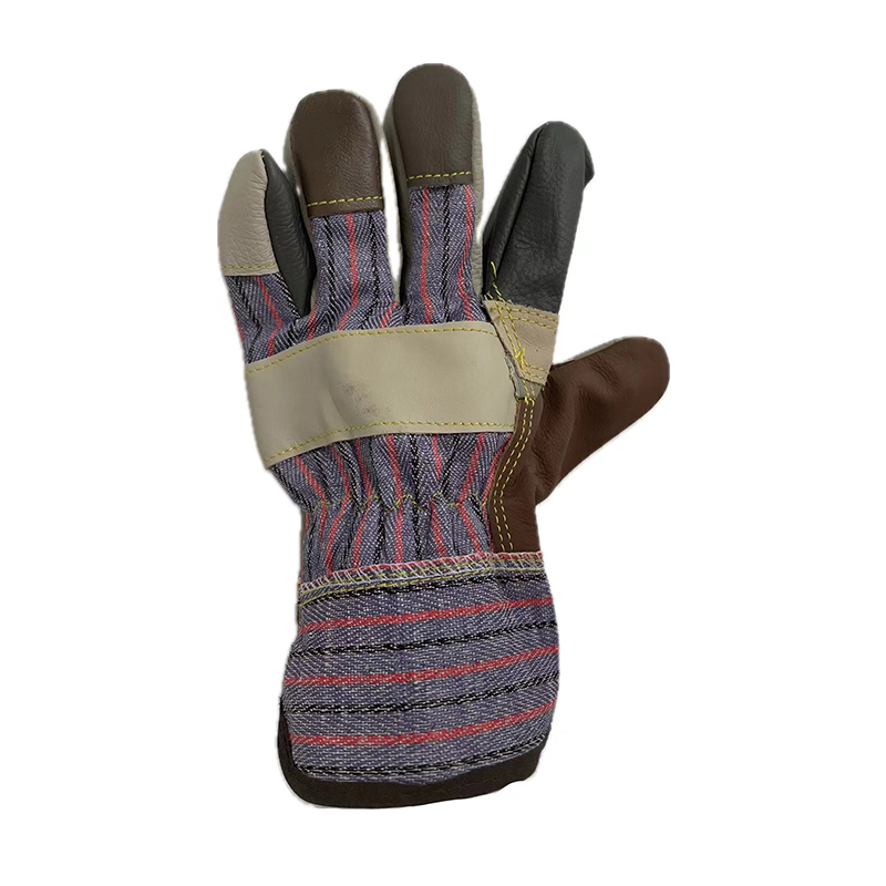 Economic cowhide furniture leather glove,assorted rainbow colors,patch palm,striped cotton and cuff.