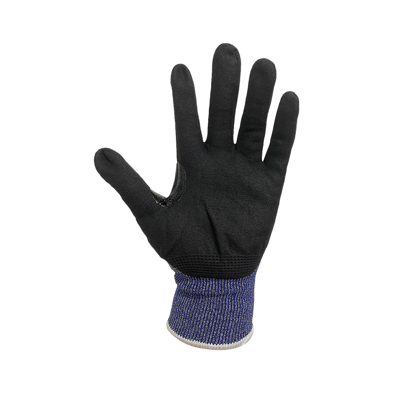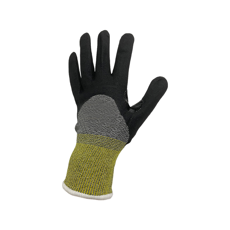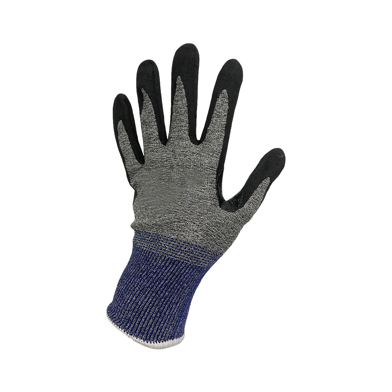 13g PE/Glass fiber,black nitrile sandy coating,with reinforced crotch on between thumb and index finger, high level cut resistance. Offers wear comfort and secure grip, screen touch capability.