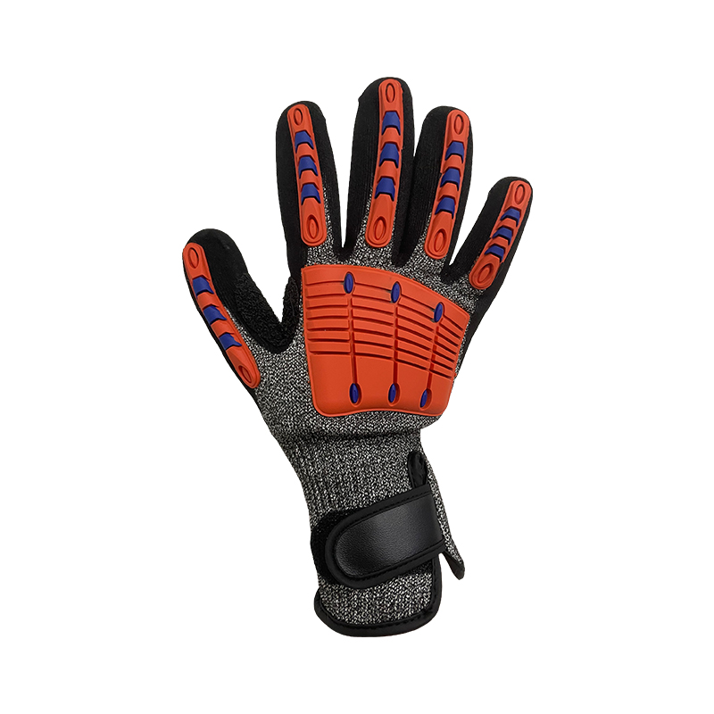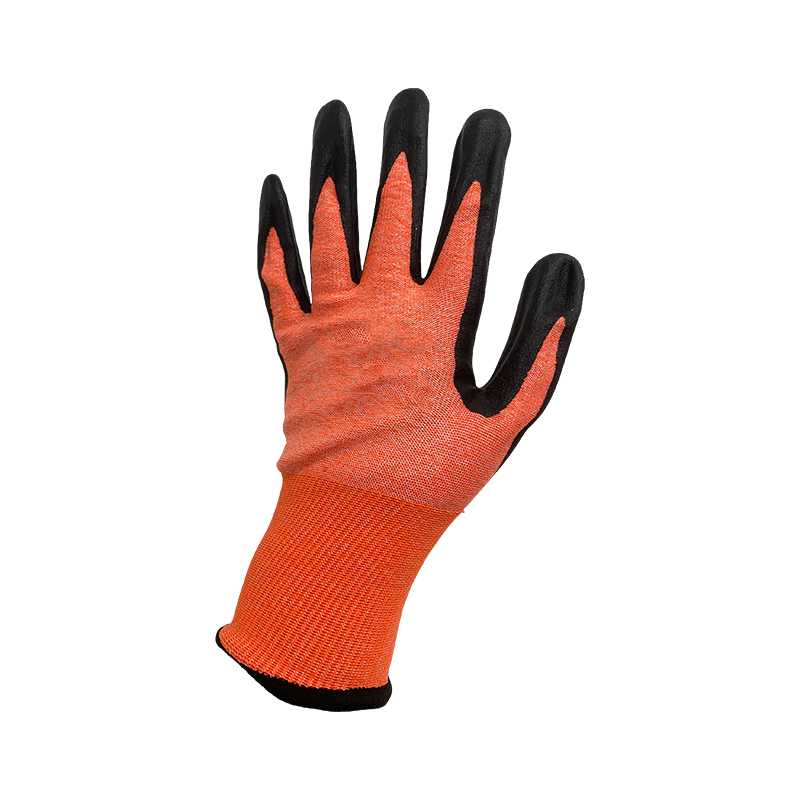 13g red/white color PE/glass fiber liner,black nitrile palm coating, high level cut resistance. Offers wear comfort and secure grip, screen touch capability.