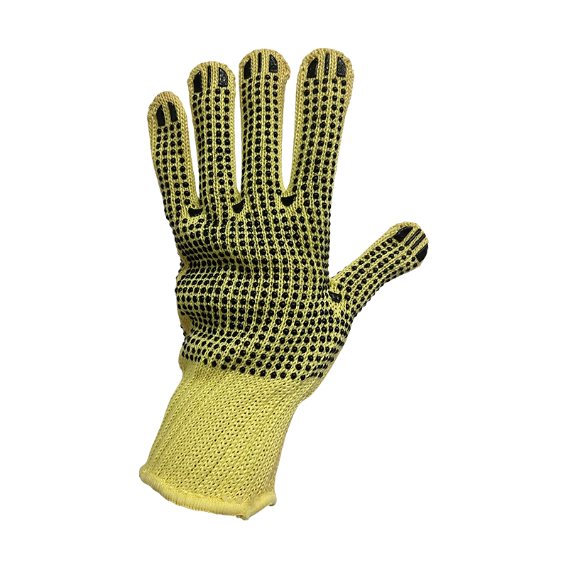 10G Aramid fiber knit glove,PVC dots on both sides,cut resistance Level D, good fit and secure grip.