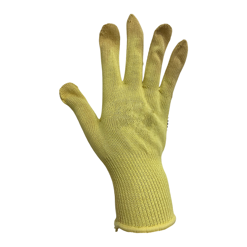10G Aramid fiber knit glove, PVC dots on palm, cut resistance level D,good fit and secure grip.