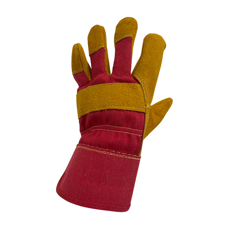Light brown cowsplit leather,red cotton back and rubberized cuff,half lined.Superior quality of leather,offers good grip and flexible comfort.