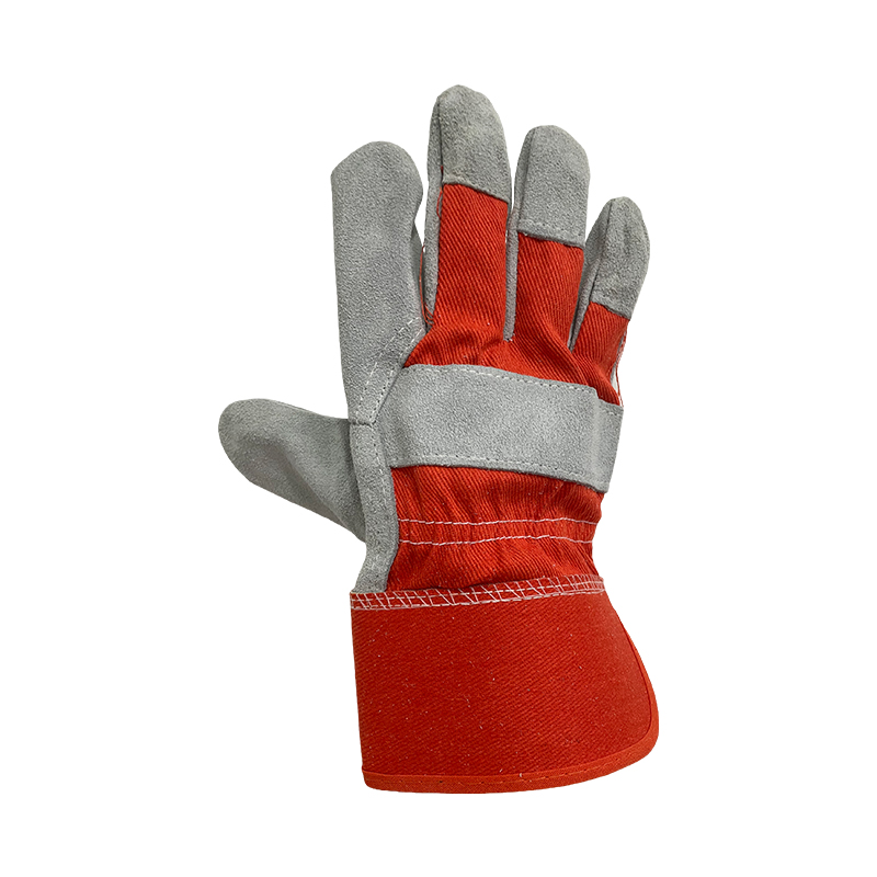 Superior cowsplit leather glove,natural color,red cotton back and rubberized cuff,high performance glove, EN 388 standard against mechanical risks,offers wear comfort and superior grip.