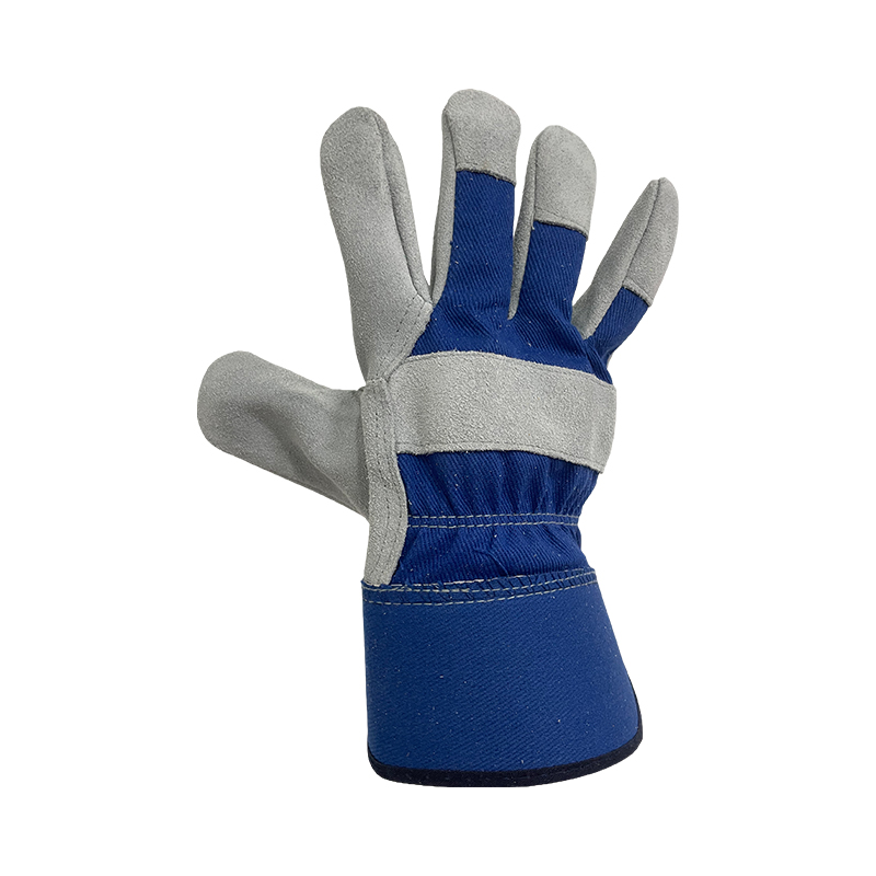 Superior cowsplit leather,natural color,blue cotton drill back and PE safety cuff,half fleece lined,good fit for secure grip. EN 388 standard