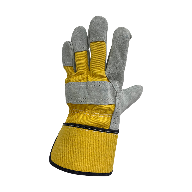 Excellent durable natural cowsplit leather,yellow cotton drill back,rubberized cuff,half fleece lined,offers good flexibility and secure grip.