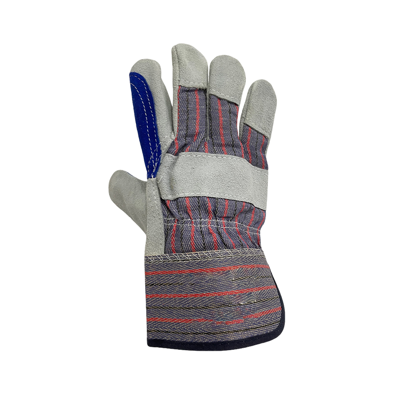 Durable cowsplit leather glove,blue cowsplit leather reinforcement on palm,striped cotton back and cuff,secure grip,high performance glove.