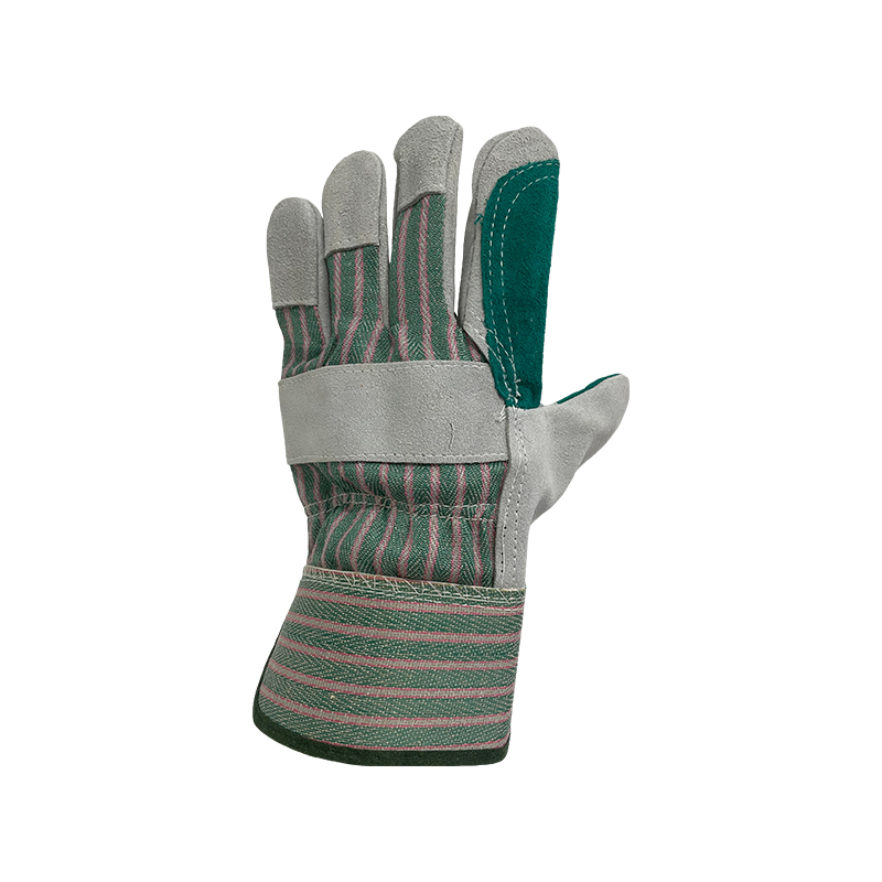 Durable cowsplit leather with green cowsplit reinforcement on palm,green/grey/red striped cotton back ,rubberized cuff,extremely tight grip,high performance glove.