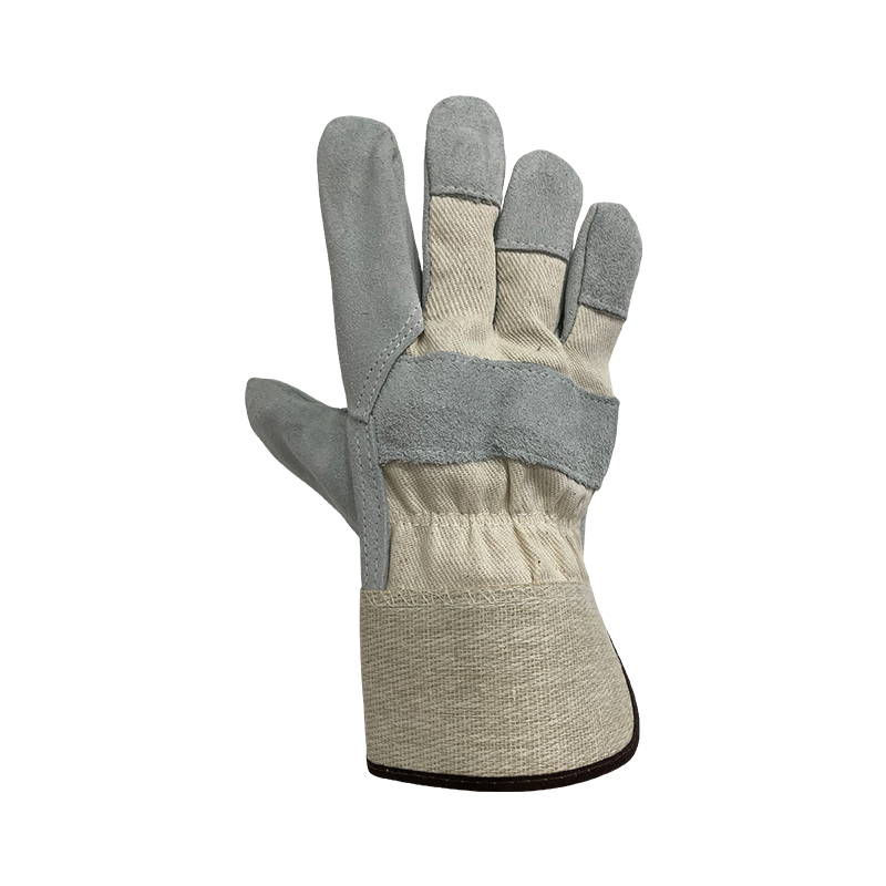 Durable cowsplit leather,natural color,white cotton back,rubberized safety cuff,half lined,secure grip,wear comfort.