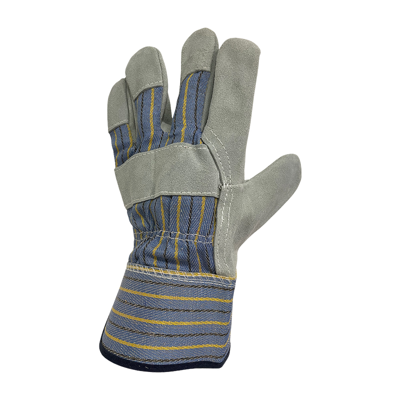 Premium select shoulder cowsplit leather,natural color,blue/black/yellow striped cotton back and cuff,half fleece lined on palm,high performance glove.