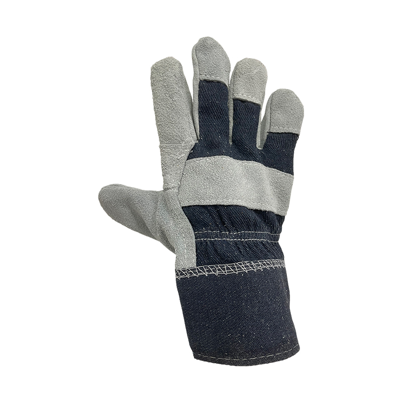 Economic cowsplit leather glove,natural color,patch palm,blue denim back and cuff,half lined,good flexibility.