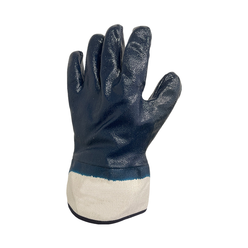 Nitrile glove,jersey cotton supporting liner,refined blue nitrile fully coating,safety canvas cuff,wear comfort,superior grip,high performance glove, resistance against mechanical risks in both dry and wet conditons.