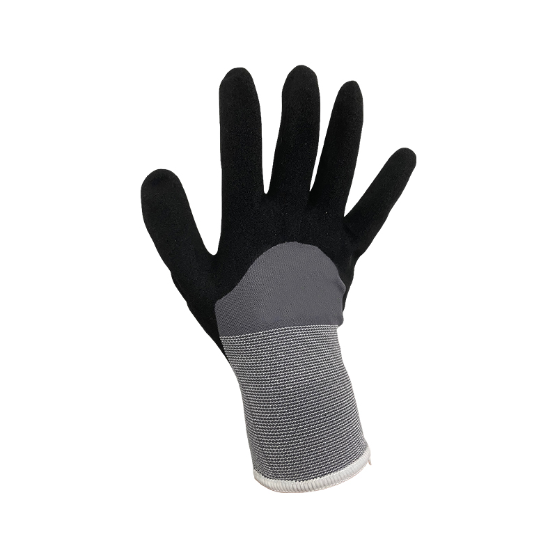 Nitrile glove,18g, grey nylon supporting liner,black sandy nitrile 3/4 coating,super wear comfort,good grip,touch screen capability.