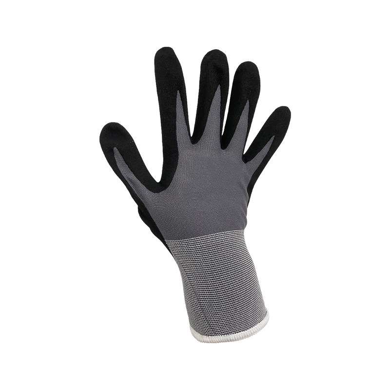Nitrile glove,seamless knitted,18g, grey nylon supporting liner,black sandy nitrile dipped palm ,superb wear comfort,good grip.