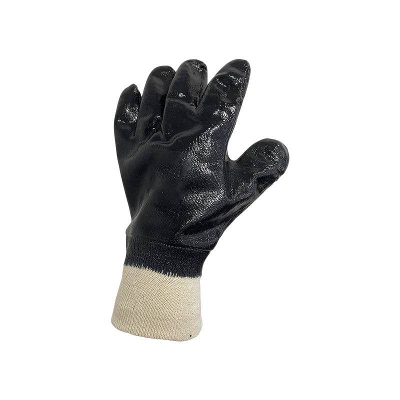 Nitrile glove,jersey cotton supporting liner,fully black nitrile coating,knit wrist,wear comfort,superior grip,water repellent palm.