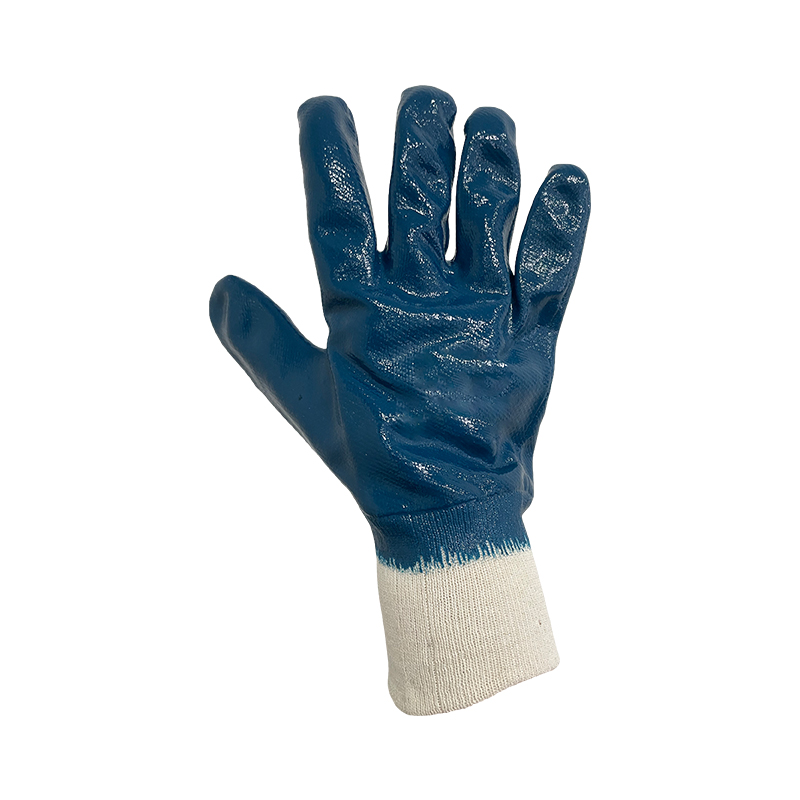 Nitrile glove,jersey cotton supporting liner,refined blue nitrile fully coating,knit wrist,good wear comfort,superior grip,high performance glove, resistance against mechanical risks in both dry and wet conditons.