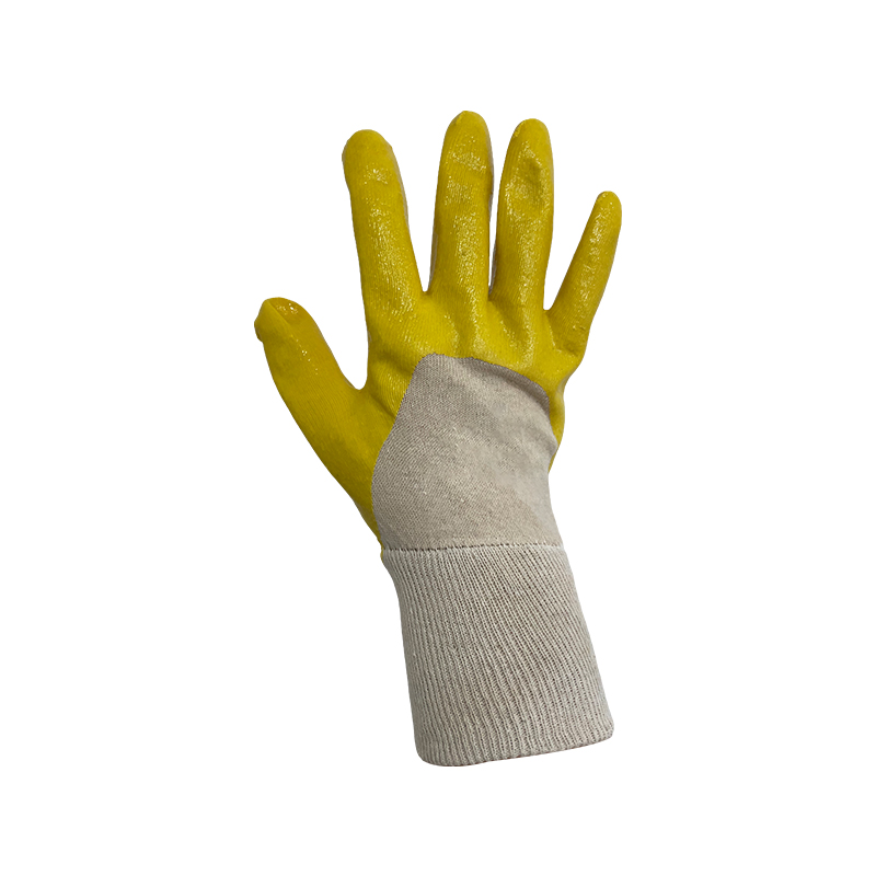 Nitrile glove,interlock cotton supporting liner,yellow nitril 3/4 coating,knit wrist,good fit for secure grip.