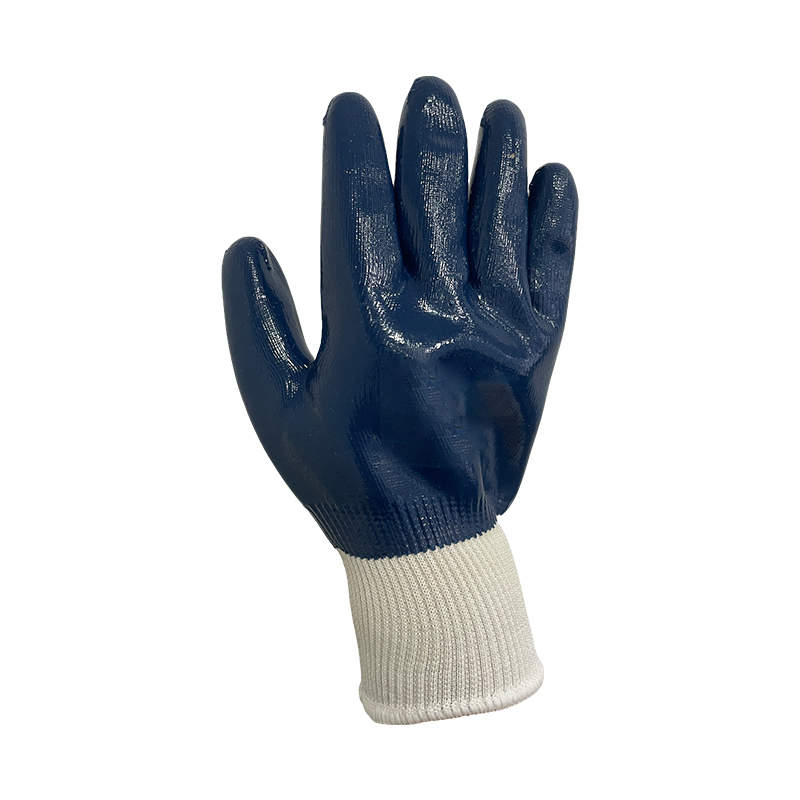 Nitrile glove,10g, polyester supporting liner,blue nitrile fully coating,polyester and spandex cuff,good fit for secure grip.