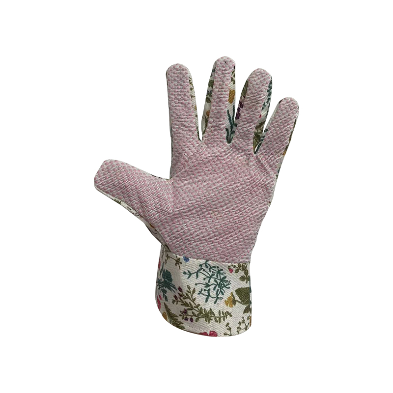 Gardening glove,assorted floral print cotton,PVC dots on palm for better grip,open cuff.