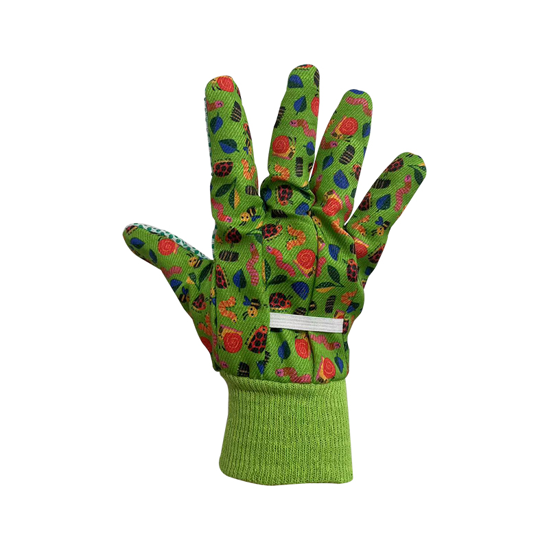 Gardening glove,assorted floral print cotton,PVC dots on palm,colorful knit wrist,good grip.