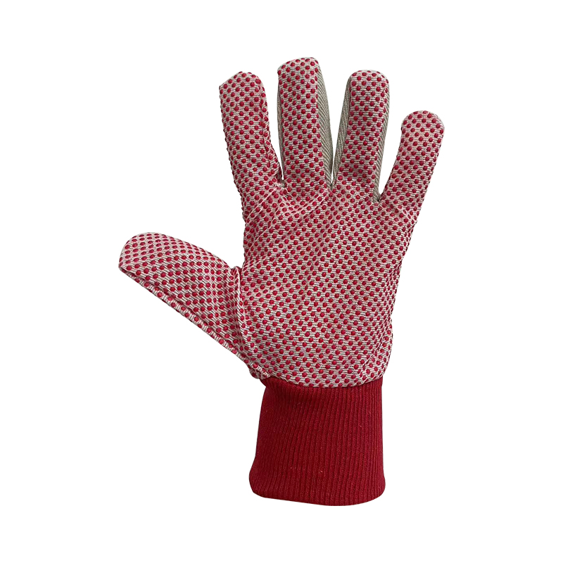 White cotton drill glove,red PVC dots on palm,red knit wrist,comfortable wear for gardening,well-drilling,planting.
