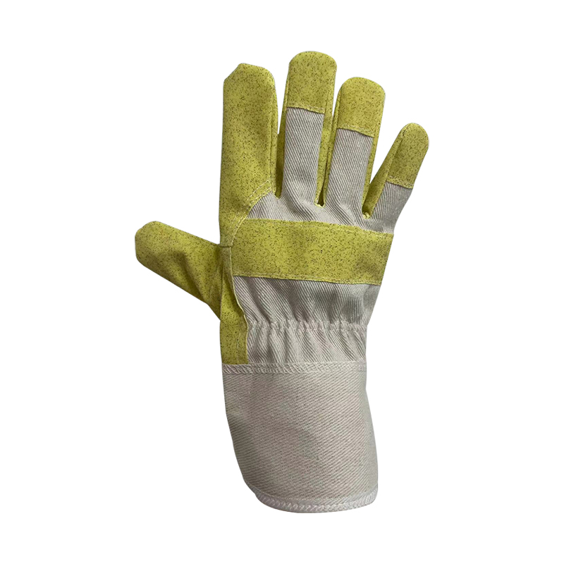 Yellow vinyl impregnated glove,synthetic leather material,rough surface for good grip,white cotton back and pasted cuff,half lined,EN 388 standard,good resistance to mechanical risks.