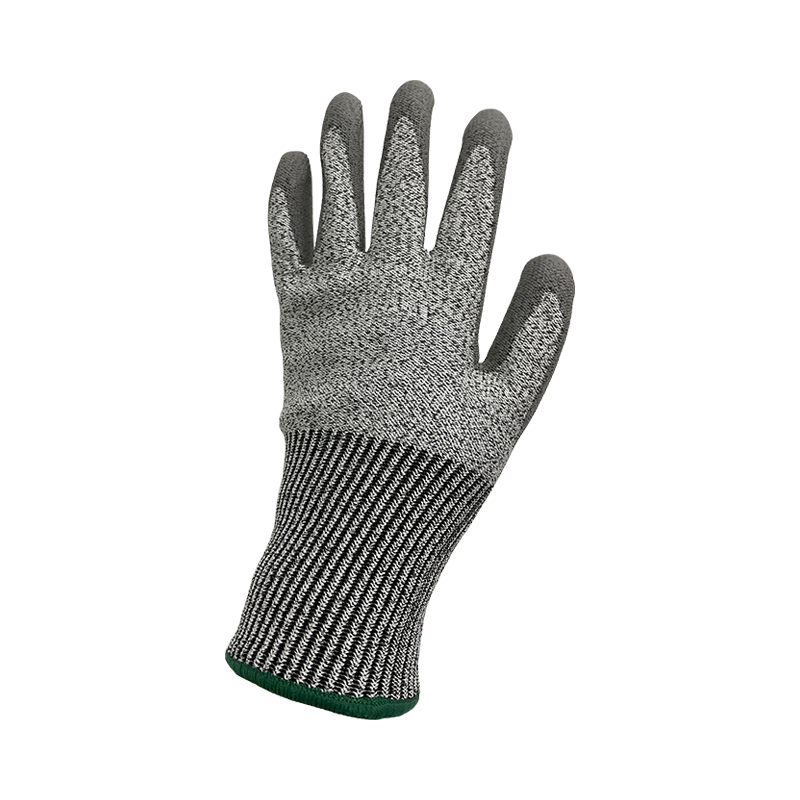 18g grey HPPE/nylon/elastane liner,grey PU dipping, high level cut resistance and abrasion resistance, screen touch capability, good breathability and superior grip.