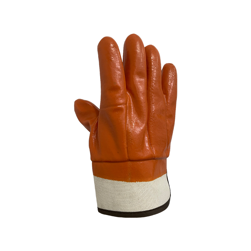 Brown color PVC dipped glove,woven jersey liner with brushed inside,canvas cuff,offer good protection against chemicals/oils.