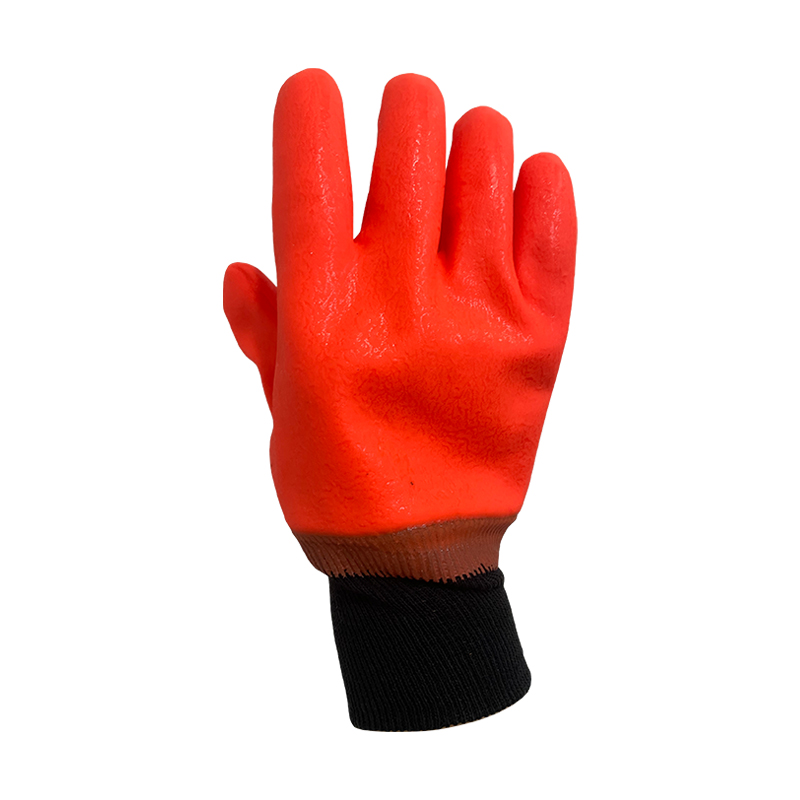 High visibility PVC dipped glove, full thick fleece lined,fluorescent orange color,brown knit wrist, providing good protection against chemical risks.