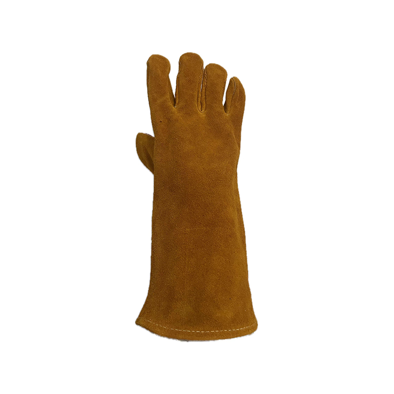 Welding glove,light brown colour cowsplit leather with red cowsplit leather reinforcement on palm and thumb,fully lining,aramid yarn stitching,high performance glove.