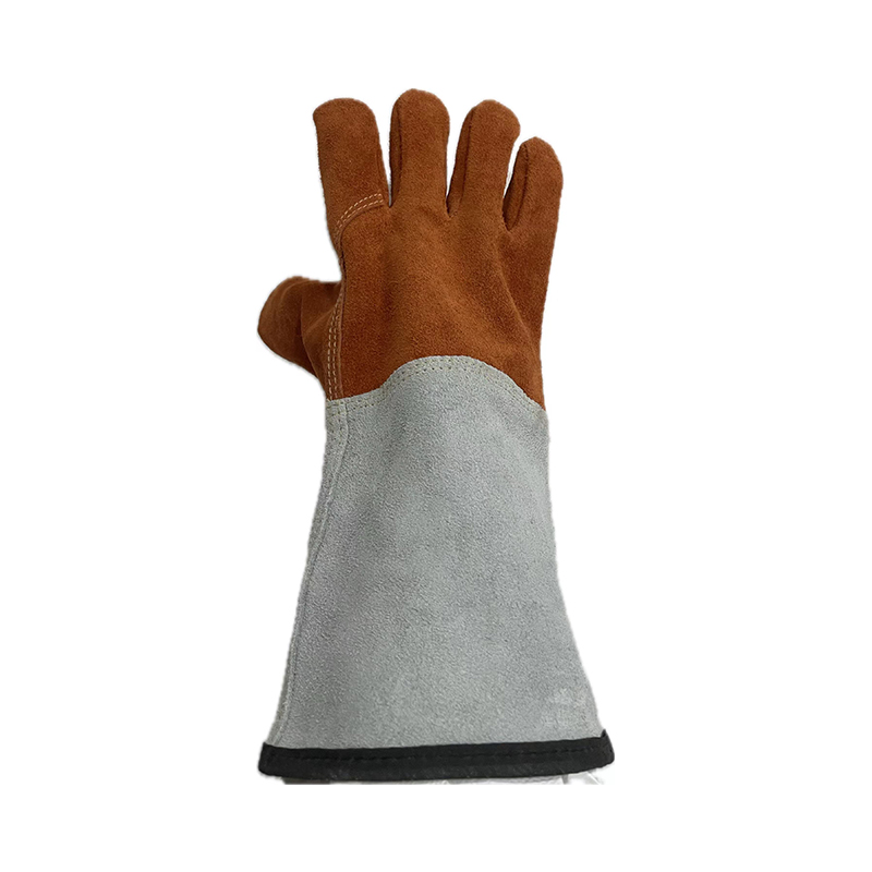 Welding glove, light brown colour select shoulder cowsplit leather palm and back,natural cowsplit leather cuff,aramid yarn sewed,fully thick fleece lining, 250°C heat contact for 15 seconds,high performance glove.