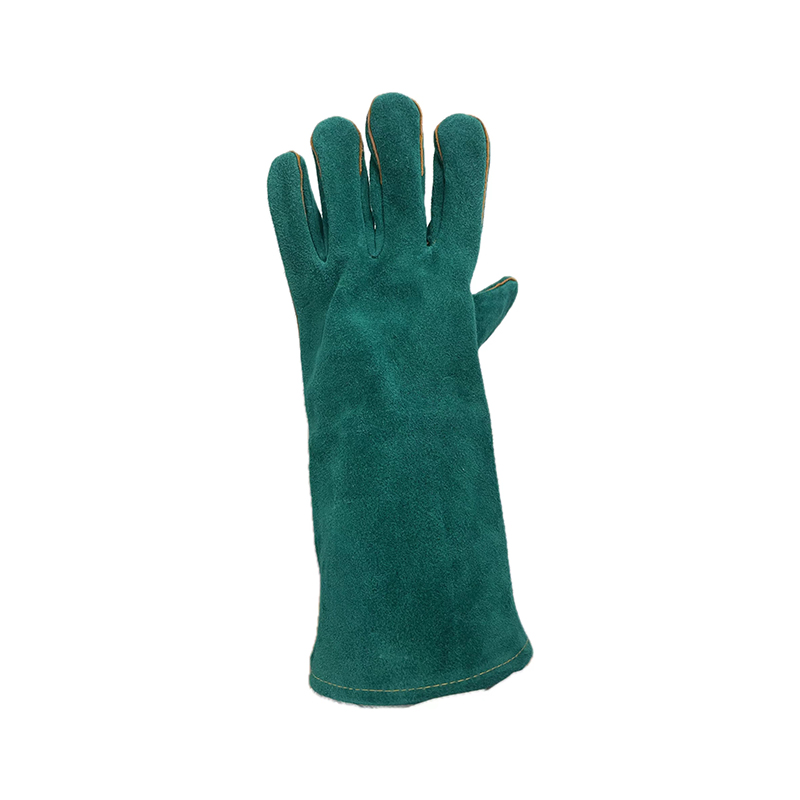 Welding glove,green color,full select shoulder cowsplit leather,heat-resistant,gauntlet,arm protection,full lining.Yellow welted seams,high performance glove.