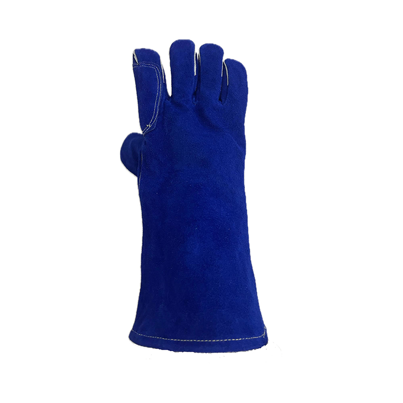 Welding glove,blue color,premium select cowsplit leather,double leather palm, aluminum foil and heat insulation lining, flame resistance,high temperature resistance,350°C heat contact for 15 seconds,welted seams,aramid yarn,high performance glove, cut resistance and impact resistance.