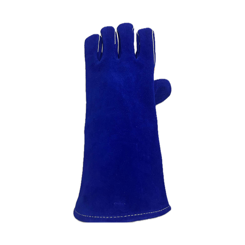 Welding glove,blue color,premium select shoulder cowsplit leather,yellow leather reinforcement on palm,welted seams,full lining,heat resistance and flame resistance,high performance glove.