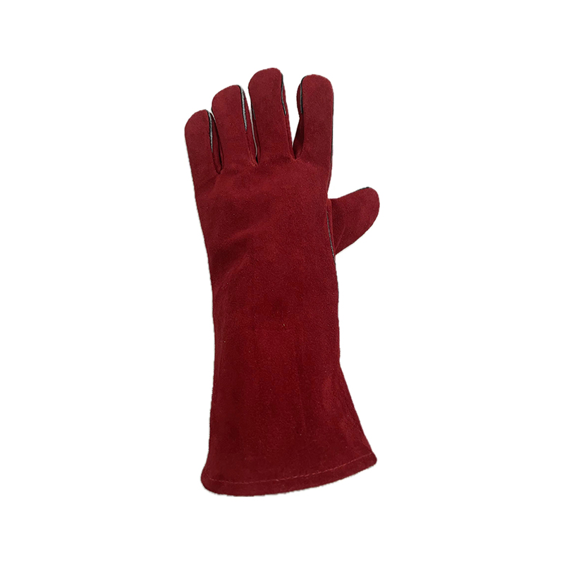 Welding glove,red color,full premium shoulder cowsplit leather,fully welted seams,heat resistance,white fleece lining inside palm and white cotton drill lining on cuff, high performance glove.