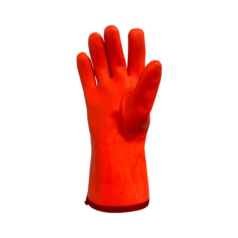 High visibility PVC dipped glove, full thick cotton fleece lined,fluorescent orange color,gauntlet, providing good protection against chemical risks.