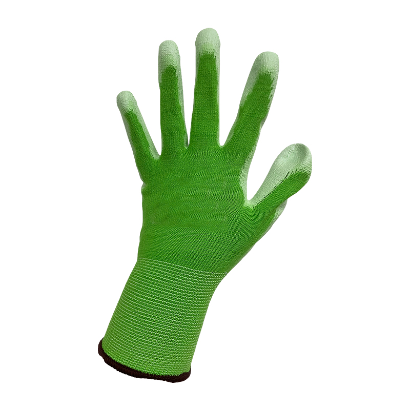 PU coated glove,seamless knitted,18 gauge,green nylon/spandex liner,white PU palm coating,good fit and secure grip, good sense of screen touch.