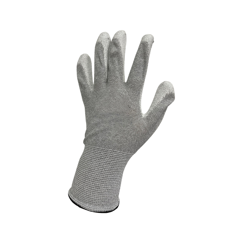 PU coated glove, seamless knitted 13 gauge,grey anti-static carbon nylon liner,white PU palm coating.