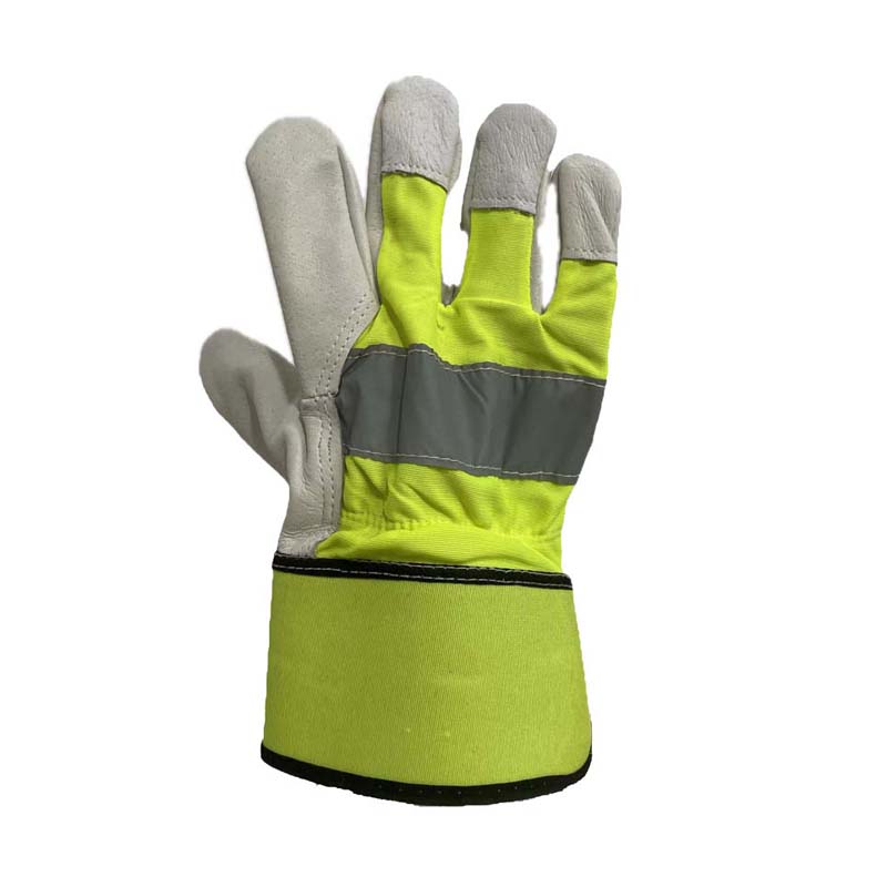 Pig leather glove,light yellow grain leather,striped cotton back and cuff,completely acrylic lined for cold environment protection.
