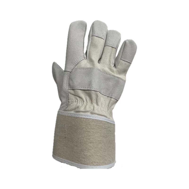 Pig leather glove,premium grain leather,natural color,white cotton back and rubberized cuff.