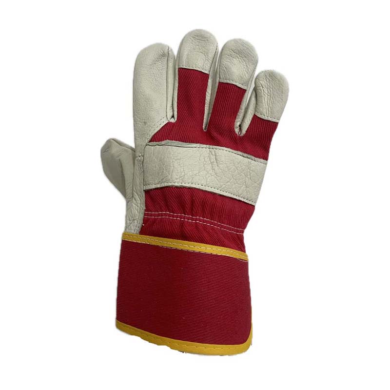 Pig leather glove,premium light yellow grain leather palm/thumb/indexfinger/fingertips,red cotton back and rubberized cuff,palm fleece lined.
