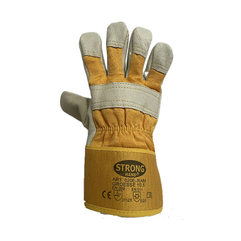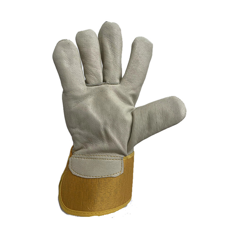 Pig leather glove,premium light yellow grain leather,yellow cotton back and rubberized cuff,double seams, full thermal insulation lining for cold protection against low temperature.