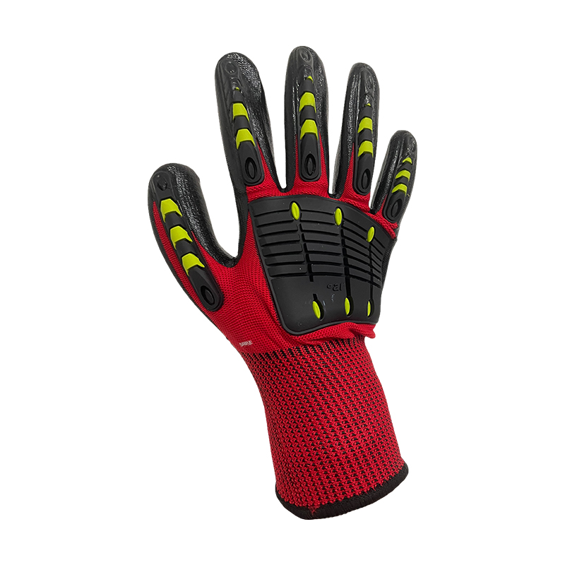 13G polyester knit glove,smooth nitrile palm coating,TPR guards on back,providing protection against impact and vibration. Secure grip high performance glove, resistance to mechanical risks.