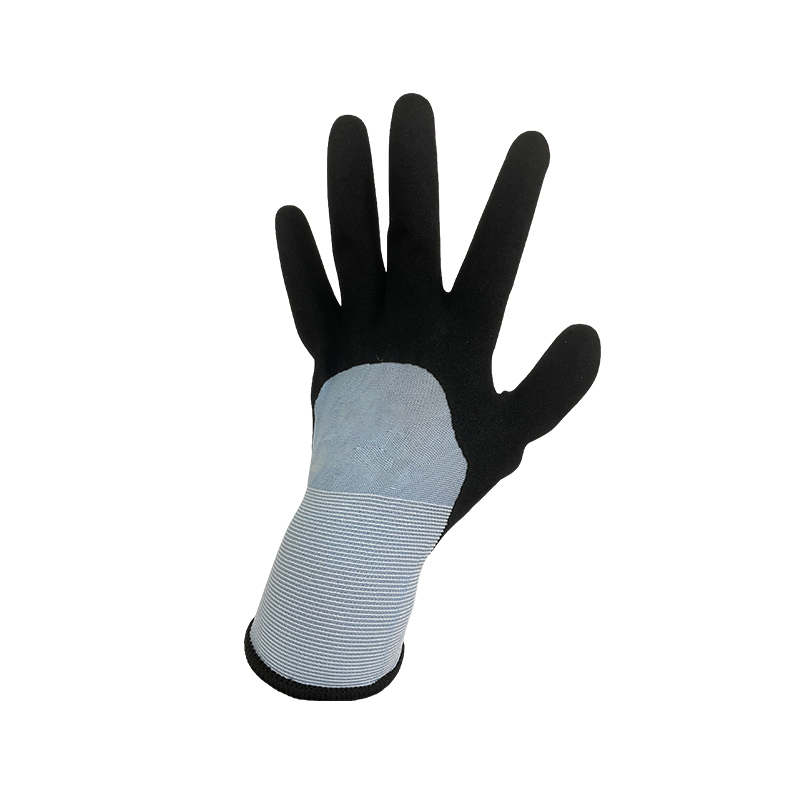 Latex glove,15g black nylon liner,orange latex foam fully coating,with black sandy finished latex second coating,very good fit for improved grip,high performance glove according to