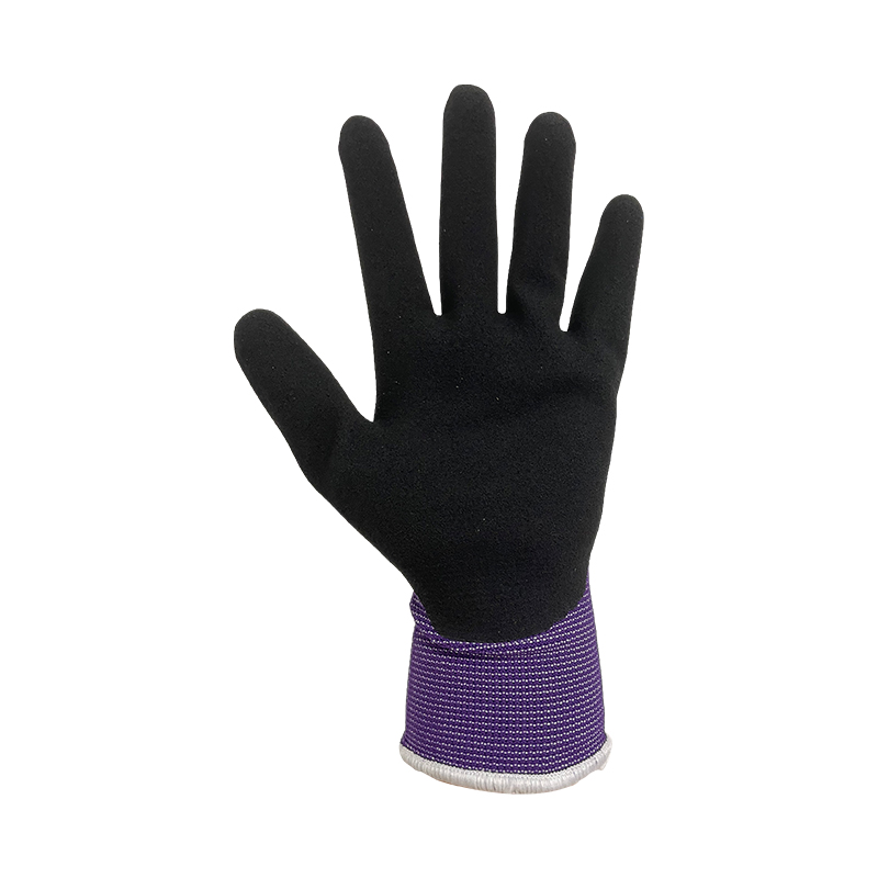 Latex glove,13g purple polyester liner,black foam latex palm coating, good fit for secure grip and good flexibility.