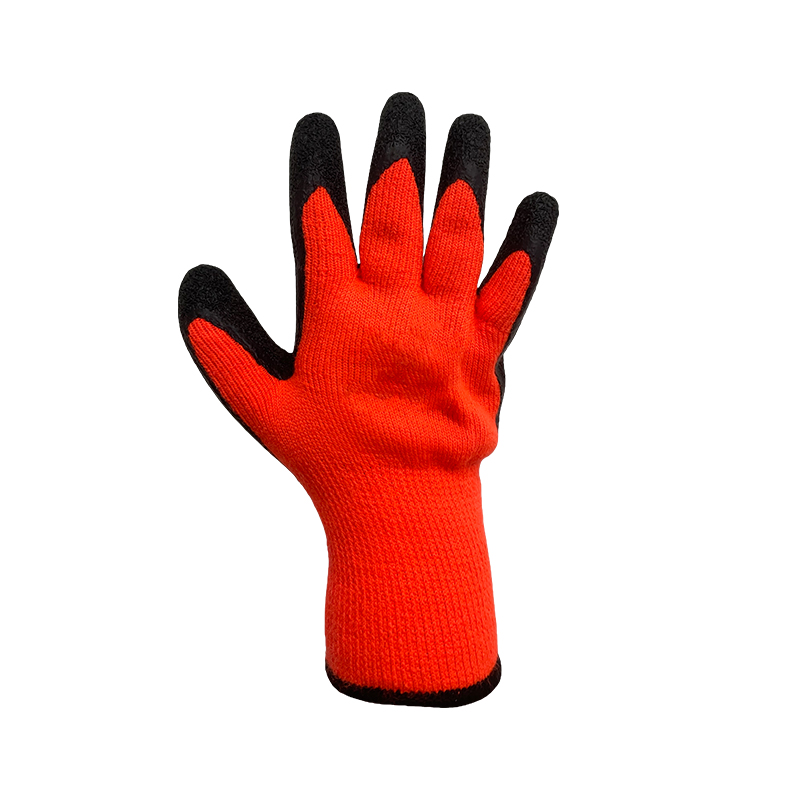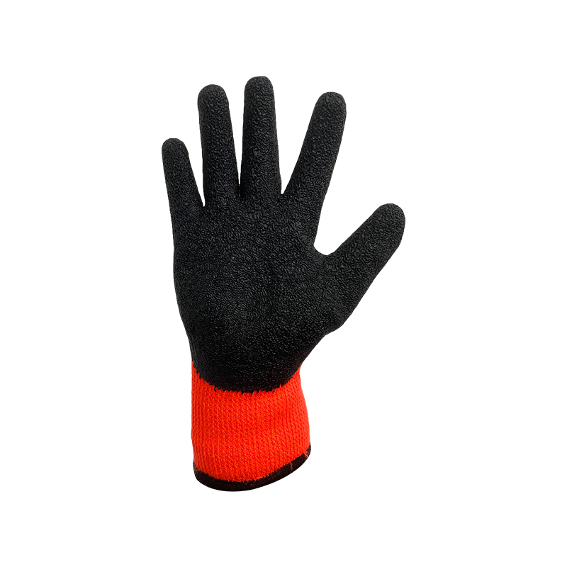 10G orange color poly/cotton knit glove,with brushed acrylic terry lining,Hi-Vis fluorescence black wrinkled latex palm coating,good protection against low temperature max -50°C